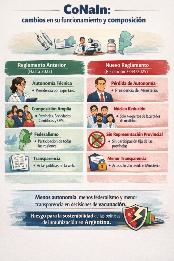 El día 22 de diciembre, el Ministerio de Salud de la Nación modificó a través de la Resolución 3344/2025 el reglamento de esta Comisión, estableciendo modificaciones sustanciales en su composición, funcionamiento, y forma de elección de sus representantes, en sintonía con modificaciones a organismos similares en Estados Unidos, cuyo Secretario de Salud se autodefine abiertamente contrario a las vacunas, y en donde se conocieron en los últimos días recomendaciones para eliminar algunas de ellas del Calendario Nacional de Vacunación de ese país.